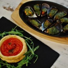 „Śródziemnomorski romans” Hiszpańskie małże zapiekane z czosnkiem i pietruszką, serwowane z tartą z ciasta francuskiego ze świeżymi pomidorami, rozmarynem, rukolą i niefiltrowaną oliwą z oliwek